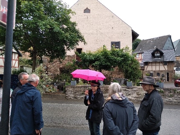 Karen Ochs-Amsterdam (mit Regenschirm) besuchte 2023 mit ihrem aus Chile stammenden Ehemann den Geburtsort ihrer „Omi Helene“. Sie versuchte bei ihrem Streifzug durch Gemünden mit Hilfe ihrer Aufzeichnungen, die sie als 18-jährige nach einem Gespräch mit ihrer Großmutter gemacht hatte, etwas über deren tragische Lebensgeschichte herauszufinden Sie suchte nach dem Wohnhaus ihrer geliebten Oma, nach dem Standort der früheren Synagoge und begab sich schließlich auf den „neuen jüdischen Friedhof“ um auf den Gräbern von Verwandten Steinchen niederzulegen. Sie fand niemanden, der Auskunft über die deutsch-jüdische Geschichte des Ortes und ihrer Vorfahren geben konnte oder wollte. Wieder in Kalifornien, wandte sie sich an den Förderkreis Synagoge Laufersweiler mit seinem Forst-Mayer-Studienzentrum für das Landjudentum. Es begann eine einjährige Recherche und ein enger Mailkontakt, der schließlich mit einem nochmaligen Besuch am 23.5.2024 und im November 2024 mit der Errichtung eines Denkmals an der Stelle der früheren Synagoge vorläufig endete.