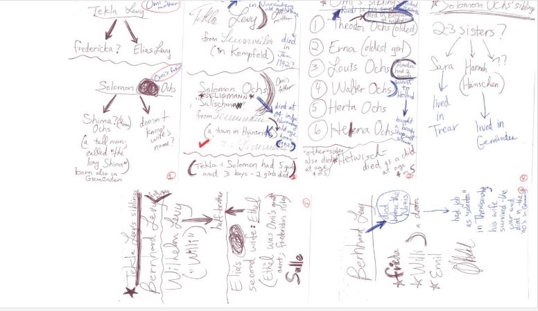 Karen Ochs-Amsterdam (mit Regenschirm) besuchte 2023 mit ihrem aus Chile stammenden Ehemann den Geburtsort ihrer „Omi Helene“. Sie versuchte bei ihrem Streifzug durch Gemünden mit Hilfe ihrer Aufzeichnungen, die sie als 18-jährige nach einem Gespräch mit ihrer Großmutter gemacht hatte, etwas über deren tragische Lebensgeschichte herauszufinden Sie suchte nach dem Wohnhaus ihrer geliebten Oma, nach dem Standort der früheren Synagoge und begab sich schließlich auf den „neuen jüdischen Friedhof“ um auf den Gräbern von Verwandten Steinchen niederzulegen. Sie fand niemanden, der Auskunft über die deutsch-jüdische Geschichte des Ortes und ihrer Vorfahren geben konnte oder wollte. Wieder in Kalifornien, wandte sie sich an den Förderkreis Synagoge Laufersweiler mit seinem Forst-Mayer-Studienzentrum für das Landjudentum. Es begann eine einjährige Recherche und ein enger Mailkontakt, der schließlich mit einem nochmaligen Besuch am 23.5.2024 und im November 2024 mit der Errichtung eines Denkmals an der Stelle der früheren Synagoge vorläufig endete.